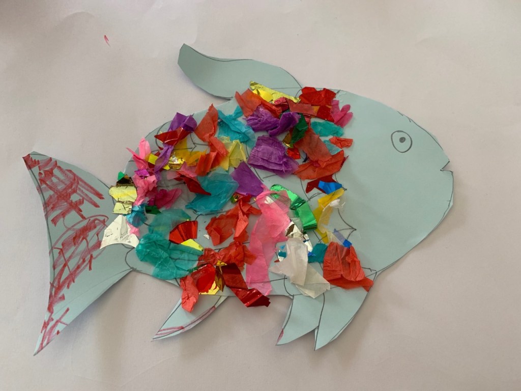 - You will need: A drawn fish template, glue, collage paper, resources to make a sea scene: See photo below.