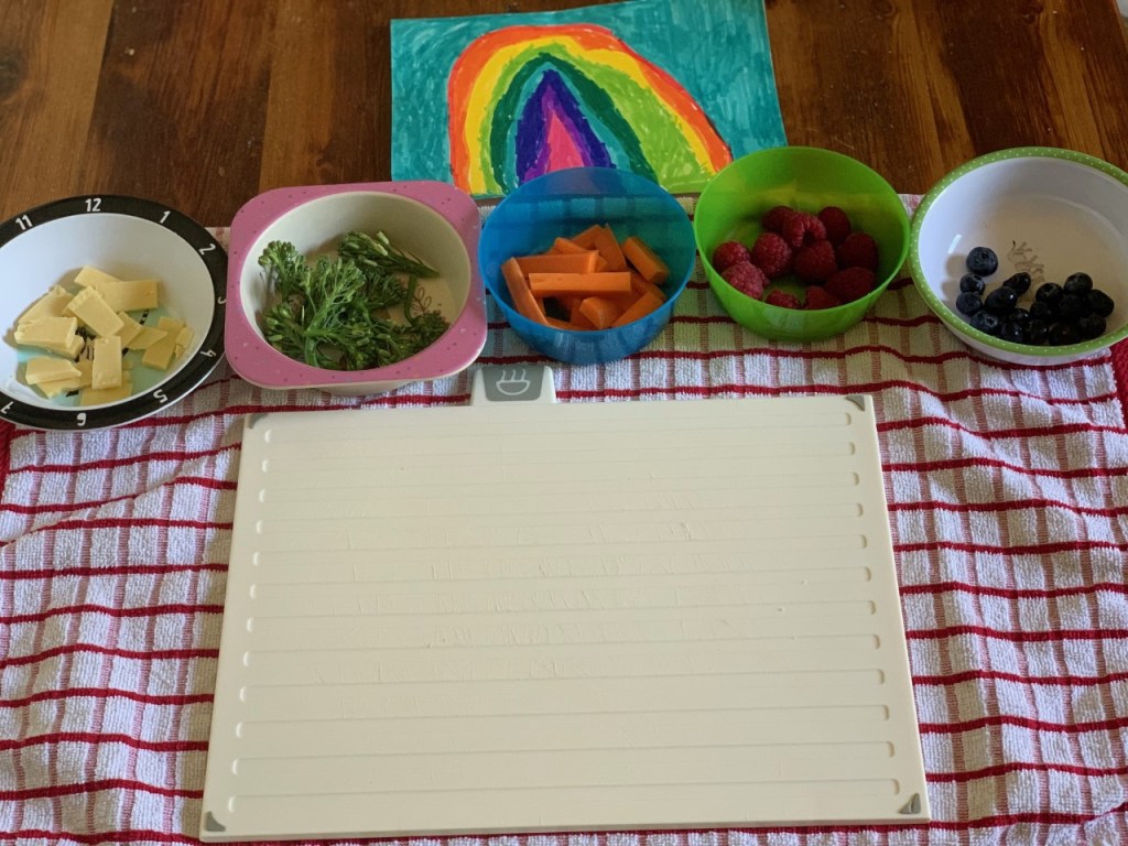 This activity involves eating, which is always popular, colour recognition, shape and fine motor control. We also had the song “I can sing a rainbow” on repeat!