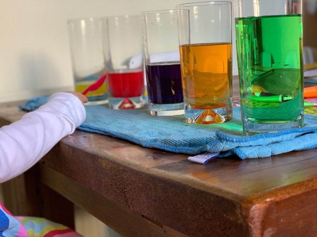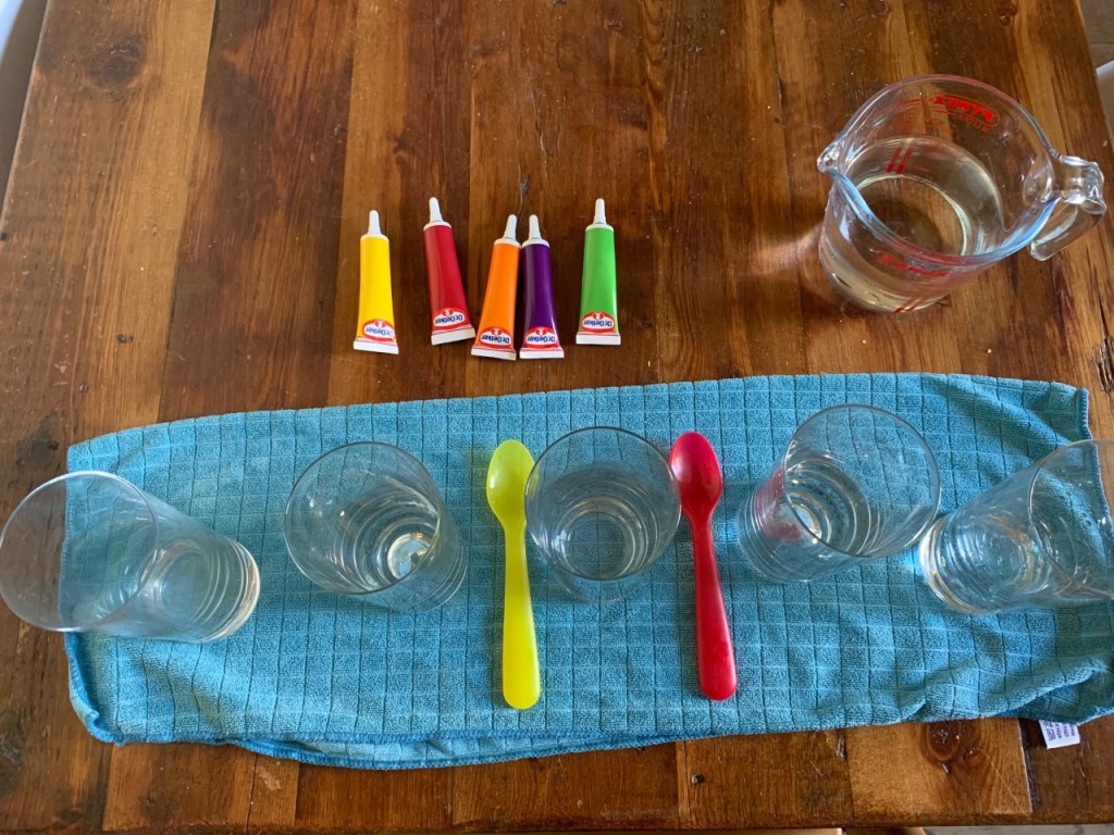 - You will need: tall drinking glasses, food colouring, water, a container to pour water and spoons for mixing.