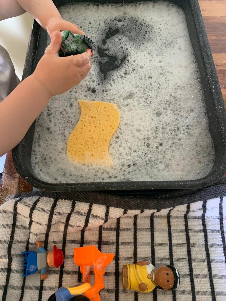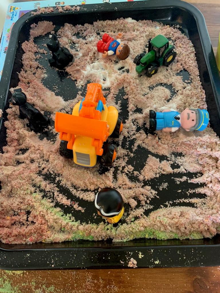 We then used the salt for small world play – we got out the digger, tractor, people and dogs and played!