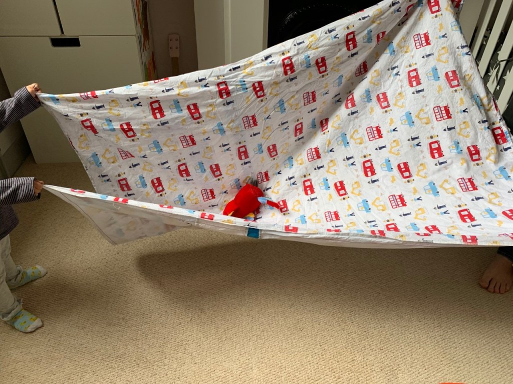 - Move the duvet up and down, as if the toy is on a trampoline, making sure the toy doesn’t fall off.
