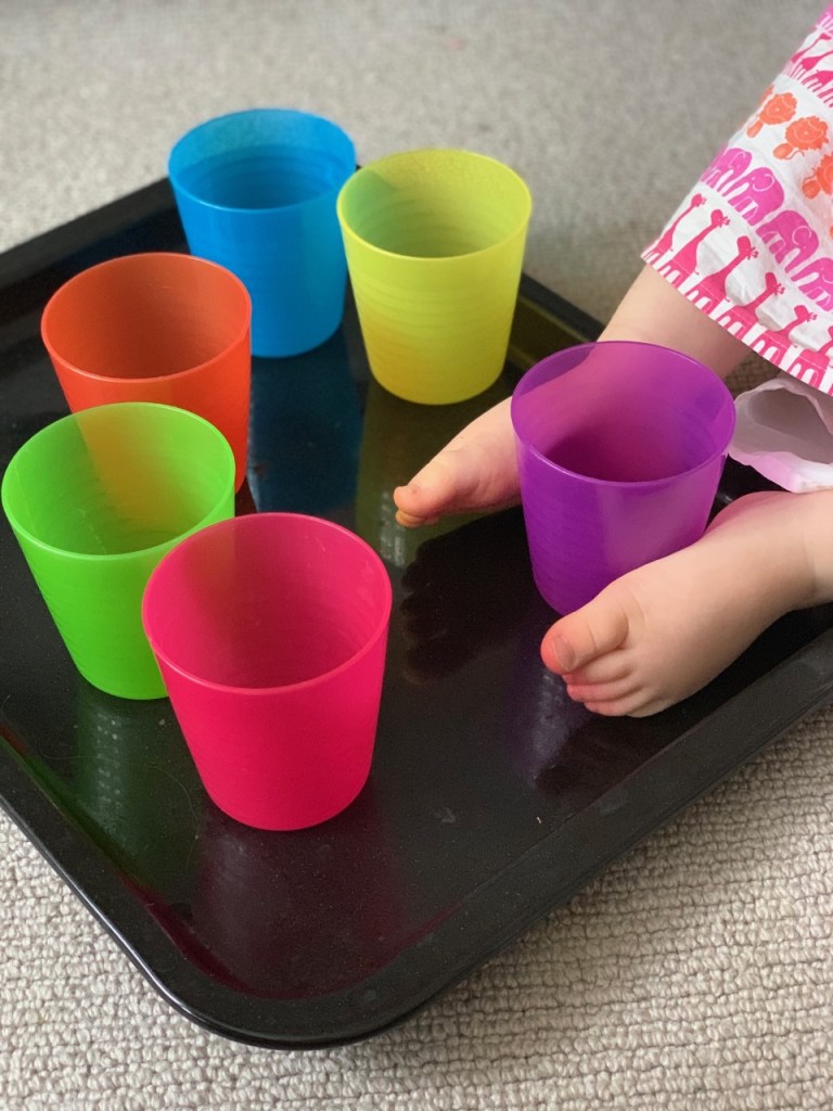 - Then walk around the house holding the baking tray of cups, making sure none of them fall off.