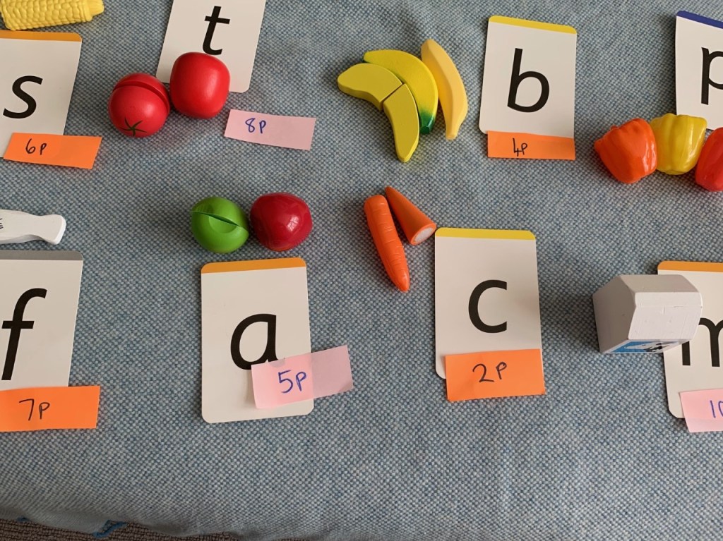 - You will need: Different sorts of food using ONLY using the sounds that your child has learnt, sound flashcards, price labels, till., money, purse, basket and bag.