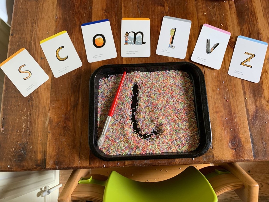This is such a quick activity to set up to help with letter formation. Rice or rice with food colouring on it placed in a baking tray and a paintbrush and off you go. Have the letters in front of your child, so that they can copy them and say the Read Write Inc writing rhymes as they write.