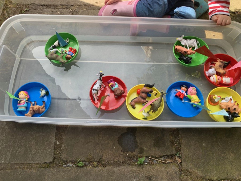 - You will need: Some bowls, cut out triangles, cocktail sticks, blu-tack, people, animals, a large tray and water.