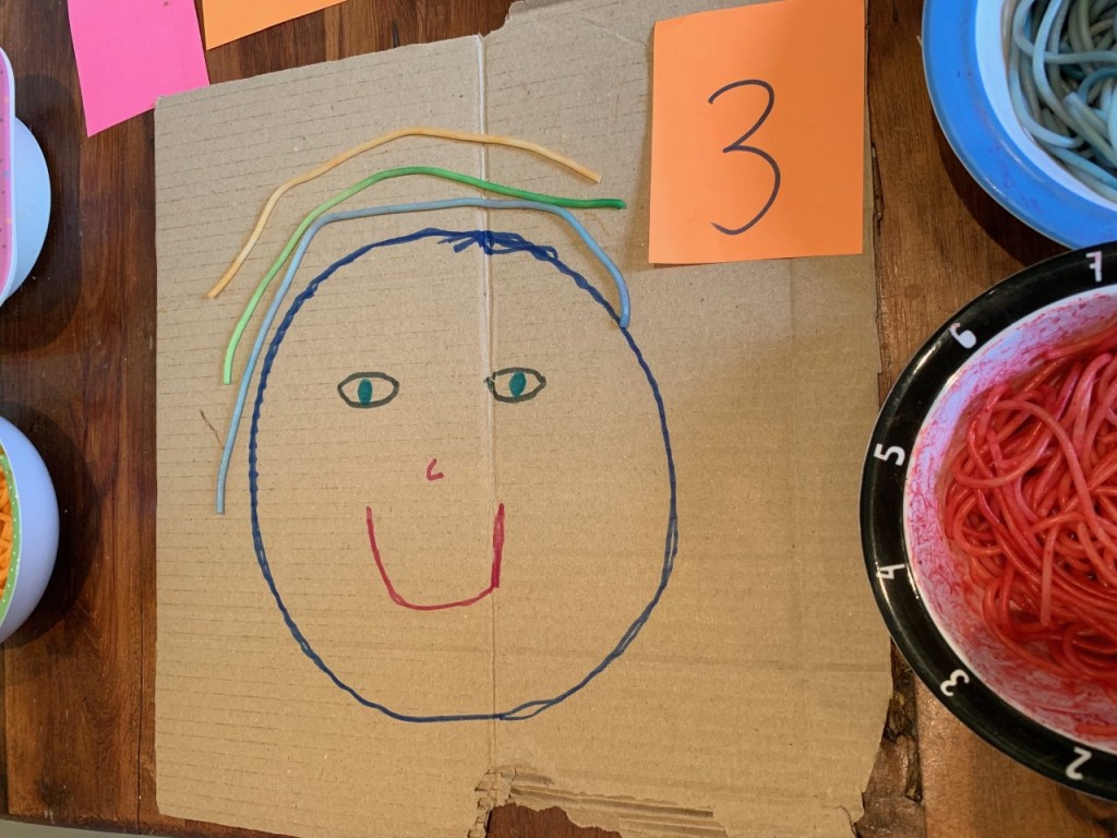- Your child will then place 3 pieces of coloured spaghetti for their hair.