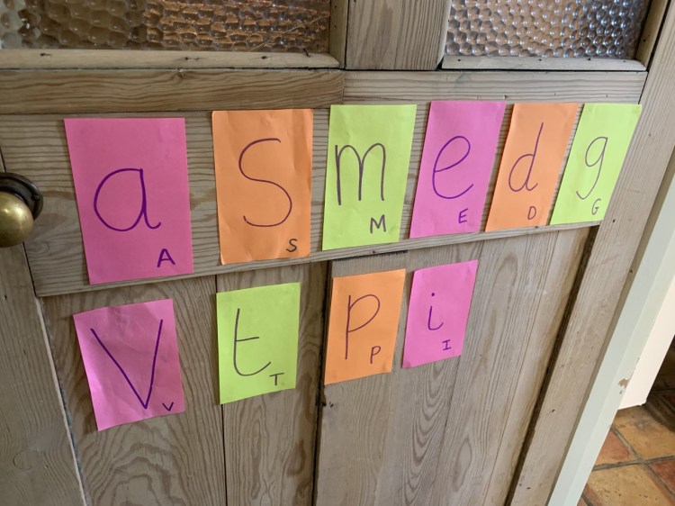 Sounds we have been learning, written on Post-it-notes and stuck on the kitchen door.