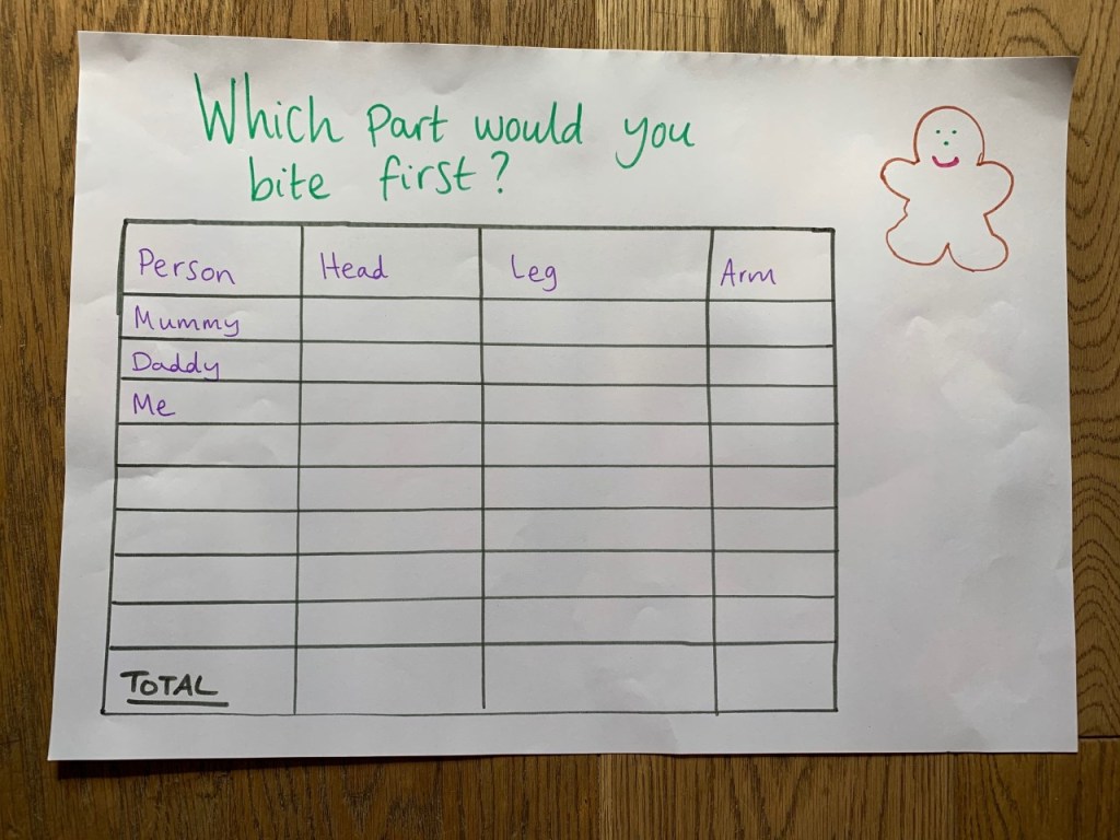 Which part of the gingerbread man would you bite first? This is a chance to ask members of the family what they would do, record the results on a table by using a tick or sticker, count up the results and discuss which body part is the most popular.