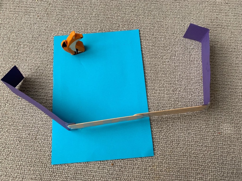 Set up an obstacle course for the fox to go on, using positional language such as: next to, on, in, under, in front of, behind, through or on top of.
