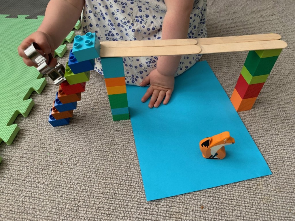 - You will need: Materials to build a bridge. We used: card, tape, lollipop sticks and Duplo.