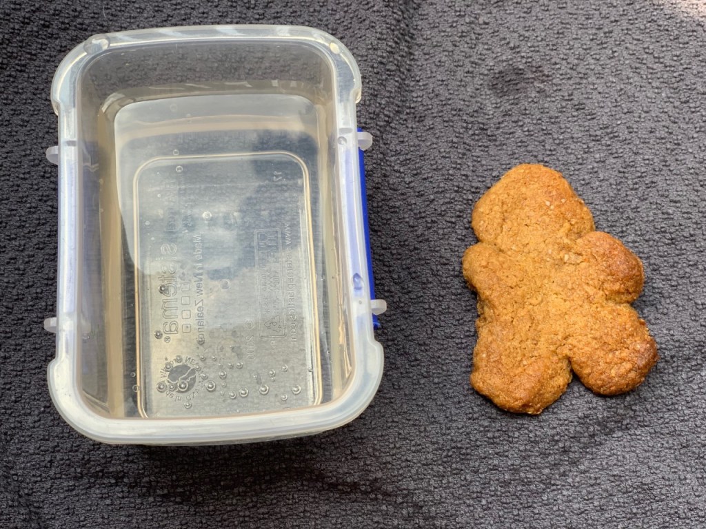 - You will need: Two gingerbread men, tongs, a clear container and water.