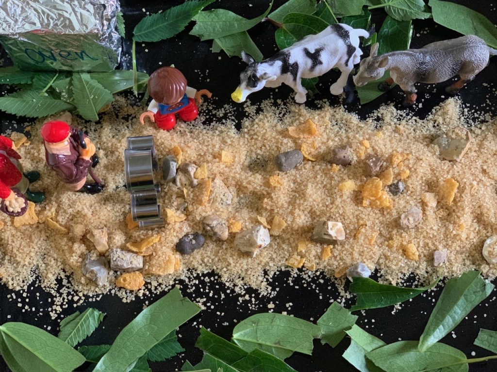 - You will need: 2 trays, oven, leaves or grass the characters in the story – the man, woman, boy, cow, horse, gingerbread man and fox. Make a path for them to walk along – we used brown sugar, cornflakes and stones. You could use mud or paper. For the river we used blue card and tore up some foil.