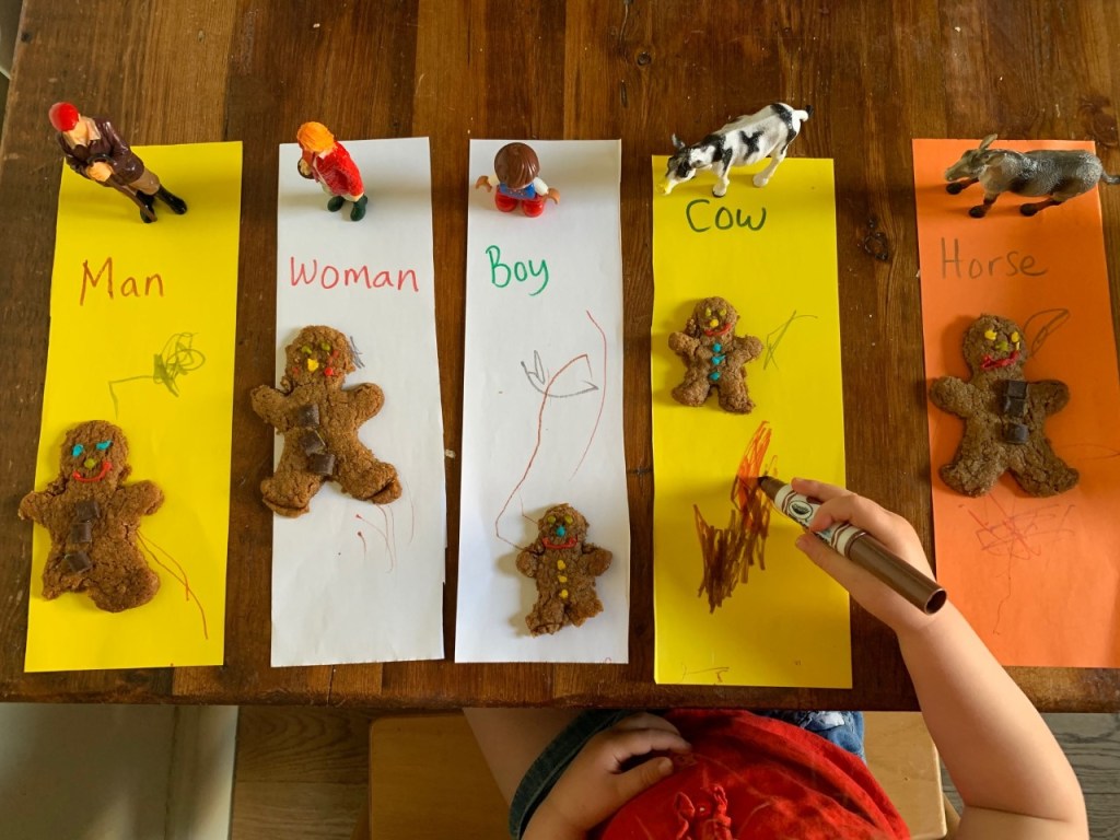 We did not think it was fair that the fox was the only character from the story who got to eat a gingerbread man. We made a name label for all of the others, so that they could eat a gingerbread man too!