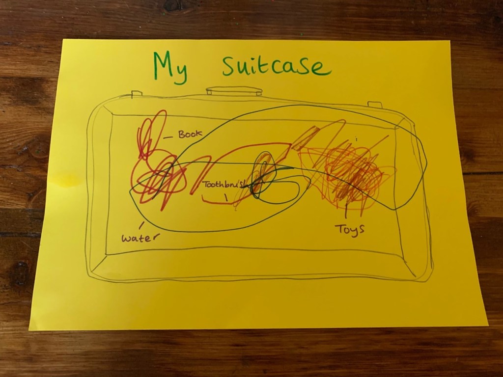 After packing everything in our suitcase we thought we should draw a picture and label it so that we don’t forget what we packed!