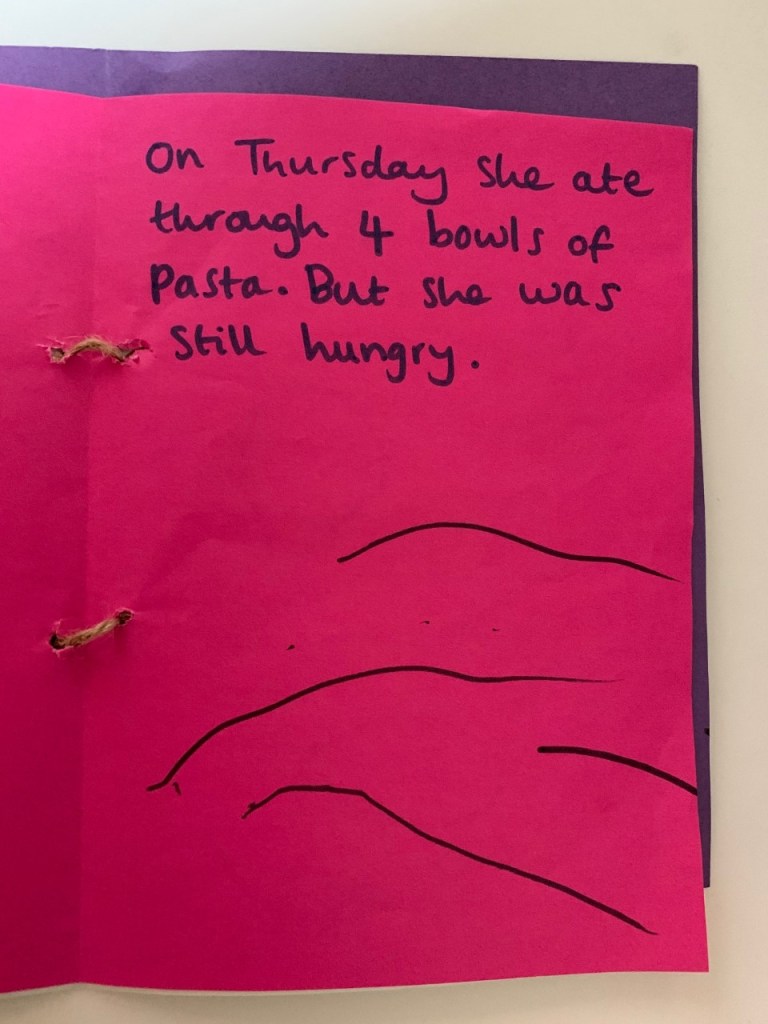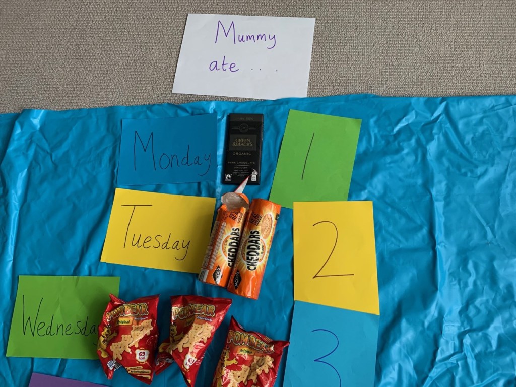 - We then retold the story from the ‘On Monday’ part. ‘On Monday Mummy ate through one chocolate bar. But she was still hungry.’