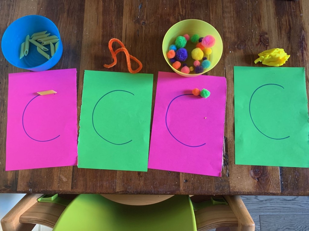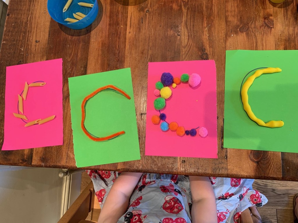 - You will need: The letter ‘c’ written out 4 times on paper, resources from your home to form the letter. We used: pasta, pipe cleaner, pom poms and play dough.