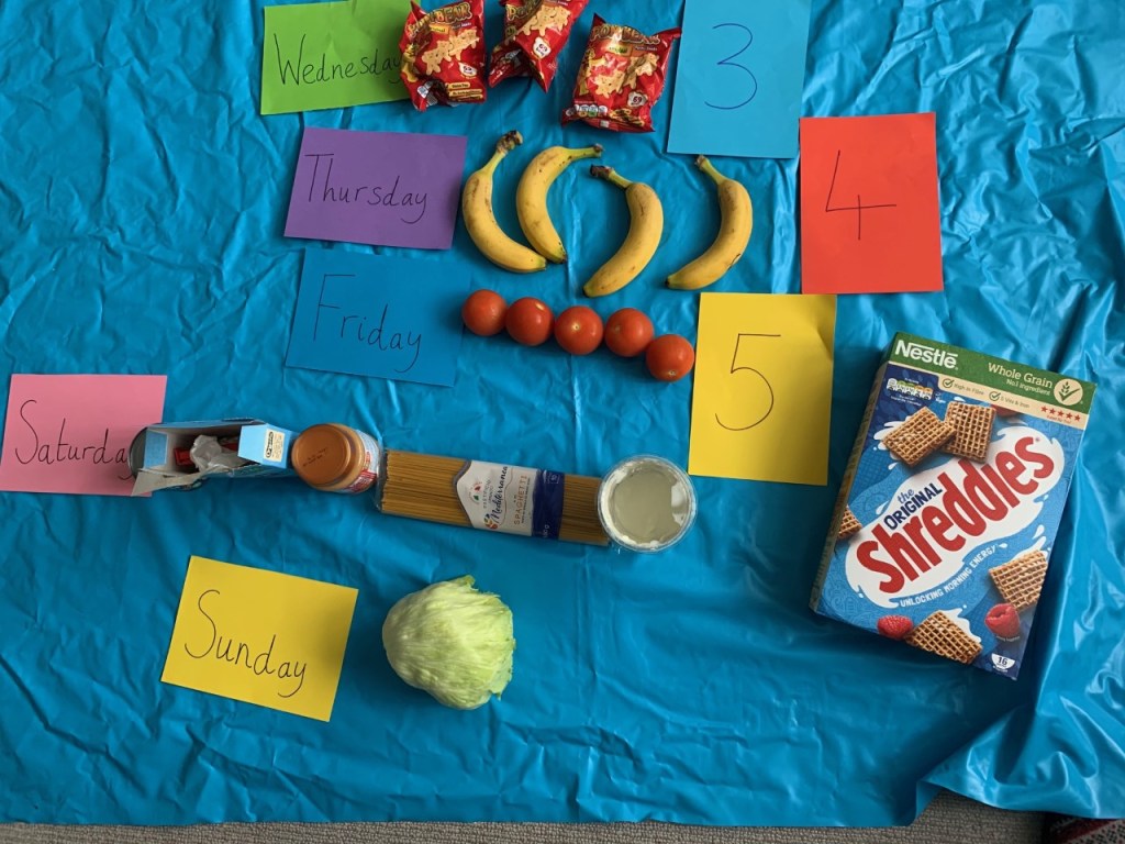 - You will need: The days of the week on card, numbers 1-5 on card, and a random selection of food.