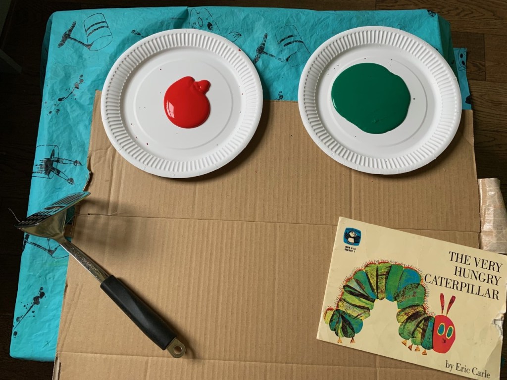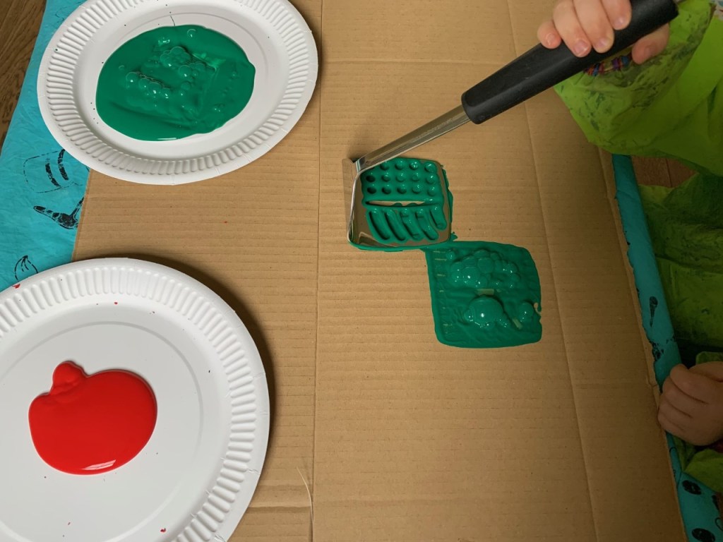 - Place the potato masher in the green paint to make the caterpillar’s body.